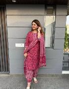 Featuring Fully Elegant Pure Muslin Suit Set Which is Beautifully Decorated With Beautiful Flower Print And Lace Detailing. It Is Paired With Matching Pants And Printed Dupatta
